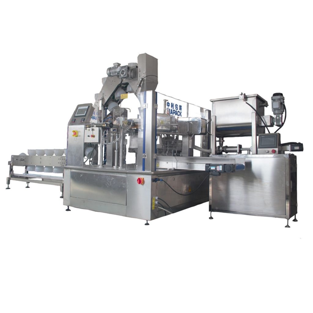 Ta stroj je zasnovan za polnjenje tekočih proizvodov, pomešanih s trdnimi izdelki, kot je , vnaprej pripravljena hrana, kot so kisle kumarice z juho, vložene olive, vložene kumare in tako naprej. Z dvigalom za posodo za dovajanje trdnih izdelkov v vnaprej pripravljeno vrečko in nato polnjenje z batno črpalko omaka .