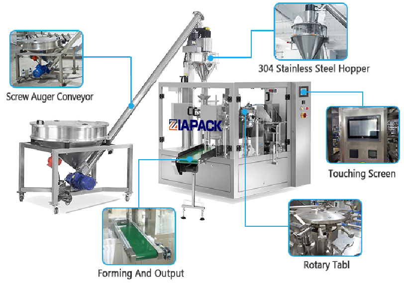 Ta stroj lahko samodejno vzame vrečko, odpre vrečko, napolni material in zapre vrečko. Široko se uporablja za pakiranje različnih praškastih materialov.